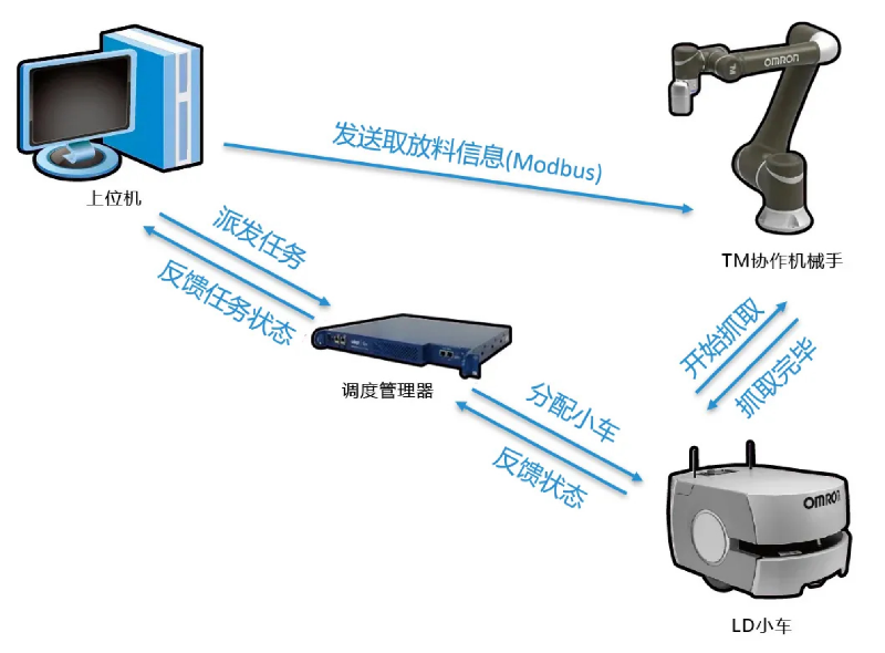 MOMA接收到上位机的搬运任务后,首先从待机位置行驶到取料工位,使用自带相机的TM协作机器人,将钻石从产线输送带上取出,放到自带的料槽上。行驶到放料工位后,再将钻石从料槽上取出,放到产线输送带上。最后回到待机位置,完成一系列的自动配石作业。