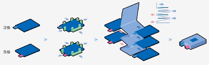 叠片机将正、负极片装入料盒中,机械手左右运动,在正、负极料盒中拾取极片,经二次定位,交替将正、负极片放在叠片台上。隔膜主动放卷,叠片台带动隔膜左右往复移动形成Z字叠绕。叠片完成后,按照设定长度切断,自动送出人工贴胶。