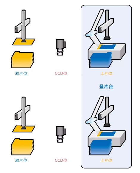 上片位动作由欧姆龙独有的机器人技术完成,这样叠片台上片位置就可以根据实际需要随意变动,可以有效缩短叠片台移动距离,提升整机效率,还可以完成极片位置纠偏功能。