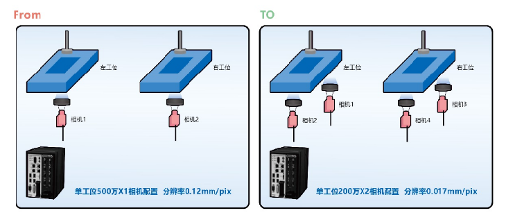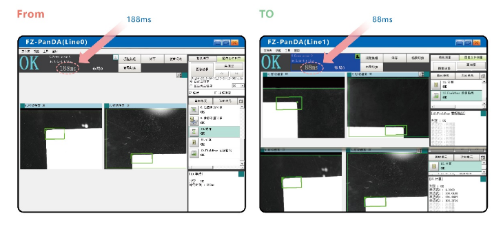 使用高速4核FH视觉控制器,一台能够同时实现多台相机独立工作以及独立数据传输,实现每个工位检测时间都在100ms以下,实现视觉部分“0”节拍浪费。