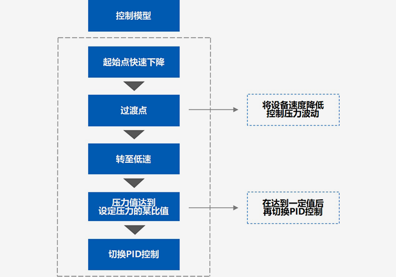 在过渡点,将设备速度降低,以控制压力波动,不让压力变化过大;在到达一定压力值后,再切换PID控制,实现压力波动≤5%,且稳定时间更短。
