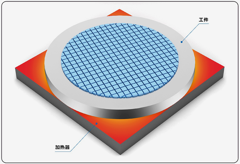 二、均胶完成后进行烘烤坚膜,通过加热盘使光刻胶中的有机溶剂挥发,生成光刻胶的超薄胶膜。