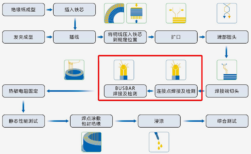 目前常规的8层扁线电机,总体的工艺流程:一、切头,完成后进入焊接工位;二、视觉引导,通过视觉确定具体的焊接位置;三、激光焊接,通过激光头,对锁定的位置进行精确焊接;四、焊点检测,最终,再通过视觉对焊点进行品质测量。