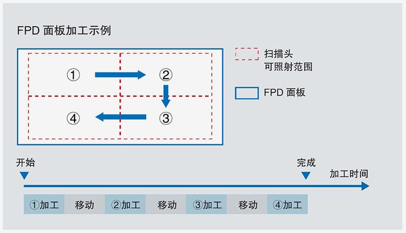以往,工作台停下后才可以加工,移动期间无法同时加工,待机时间导致产能下降。