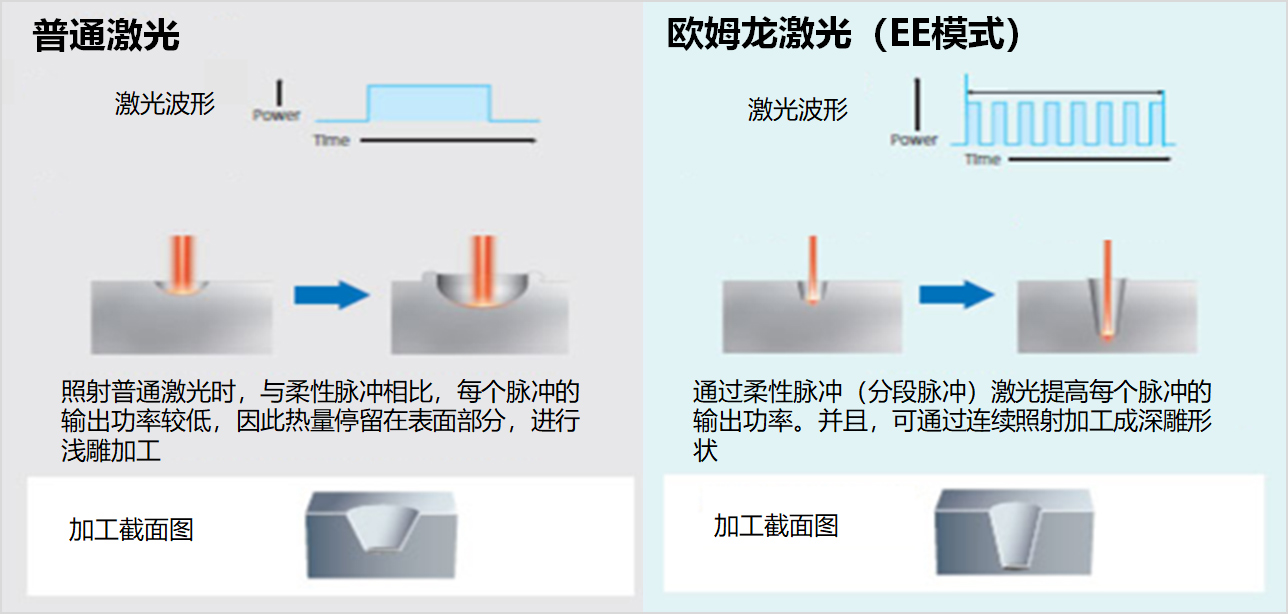 通过使用特殊技术控制激光波形的脉冲宽度,可以集中在同一位置施加能量进行刻印。
