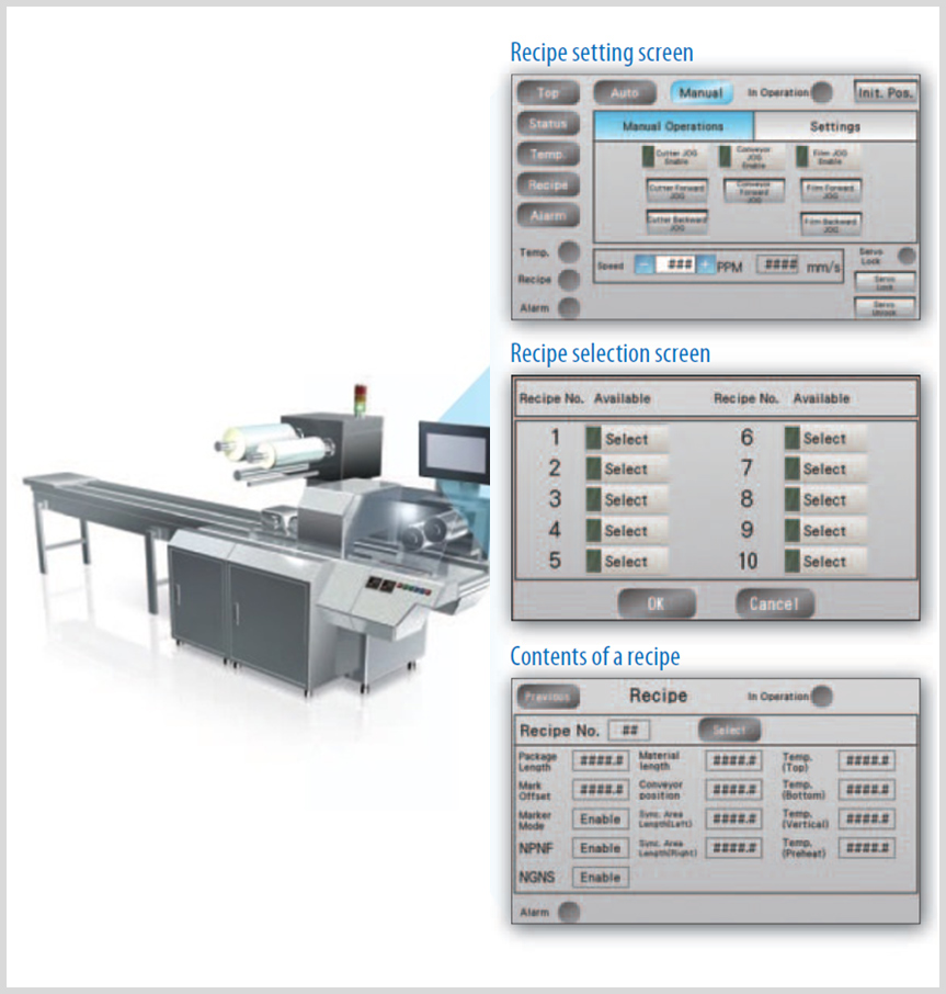 通过“包装机换产时调整项目的‘配方化’、‘提供HMI设定画面’”,不需要专家也能进行换产,实现了运行效率的提升。