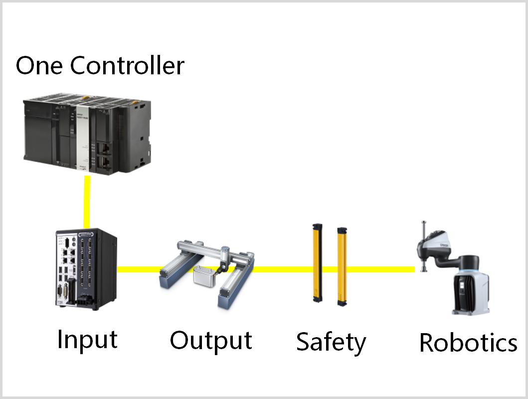 统一机器人和机器控制的编程语言,使用1种编程语言(IEC语言)来控制机器人。在一个CPU内,PLC能够通过一次扫描同步机器人、运动控制和传感器的信号,为缩短设备节拍作出贡献。