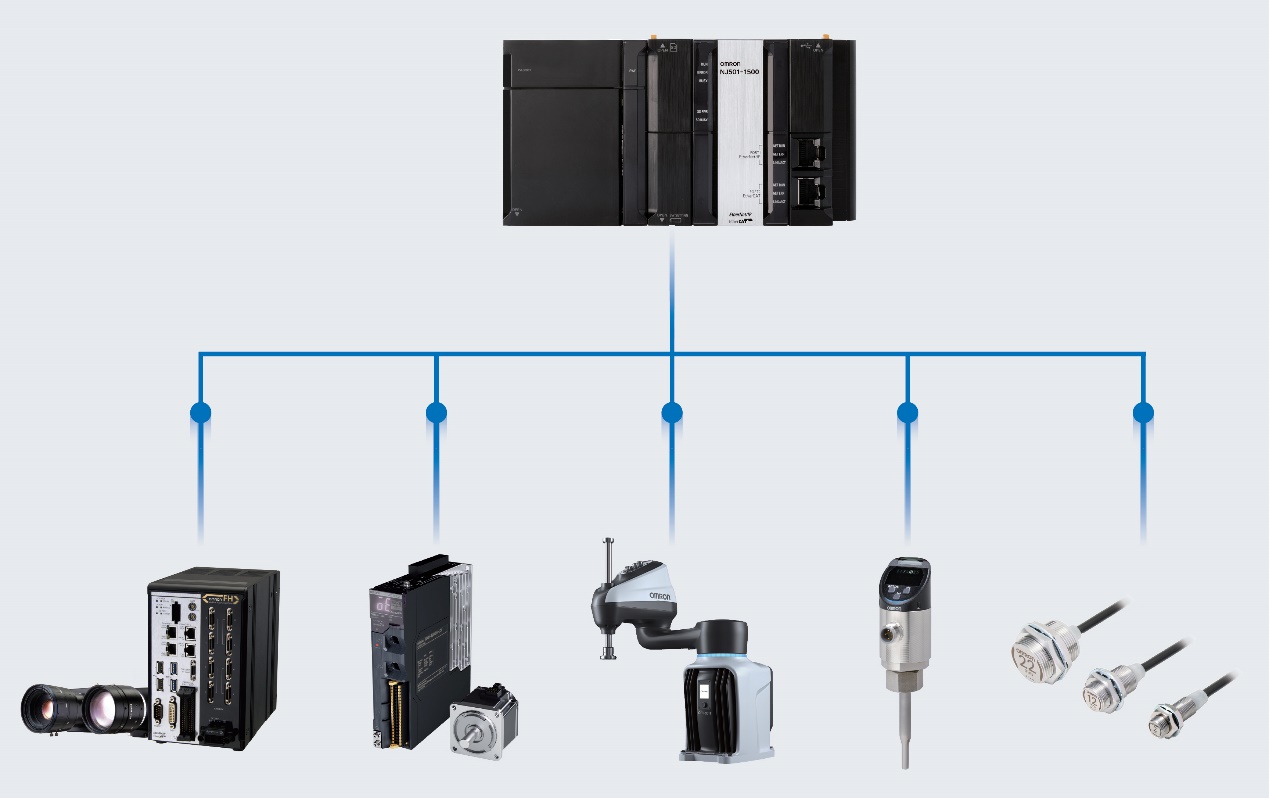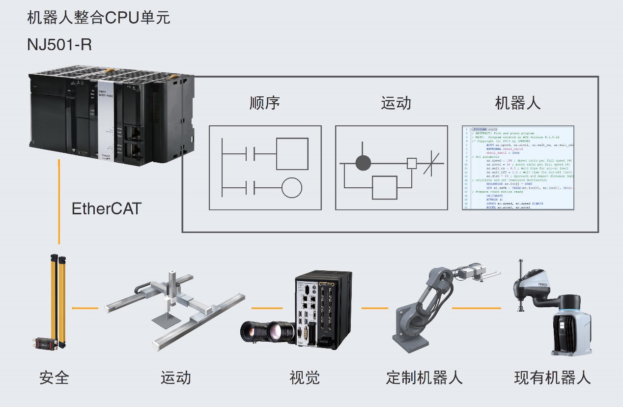 通过导入欧姆龙革命性的机器人统合控制器,将循环扫描型程序执行(PLC功能)和顺序执行型程序执行(机器人功能)的两个具有完全不同特性的引擎整合至One Controller,使两者的程序任务、I/O刷新同步运行。